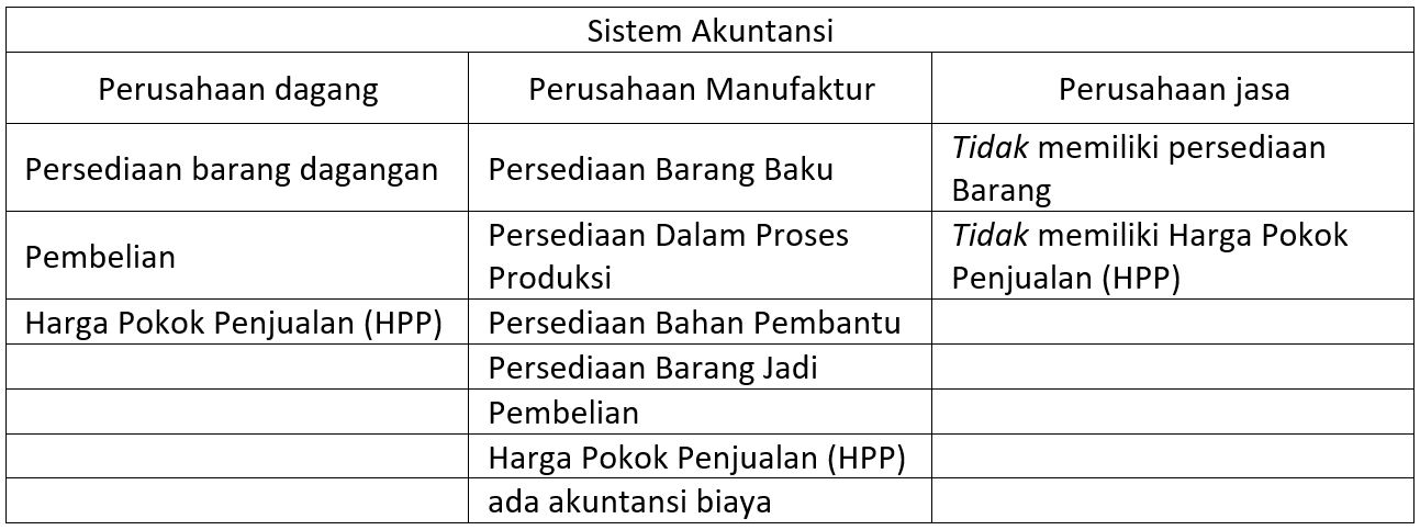 - Perusahaan manufaktur terdiri dari persediaan batang baku, persediaan dalam proses produksi, persediaan bahan pembantu, persediaan barang jadi, pembelian, harga pokok penjualan (HPP), dan terdapat akuntansi biaya.